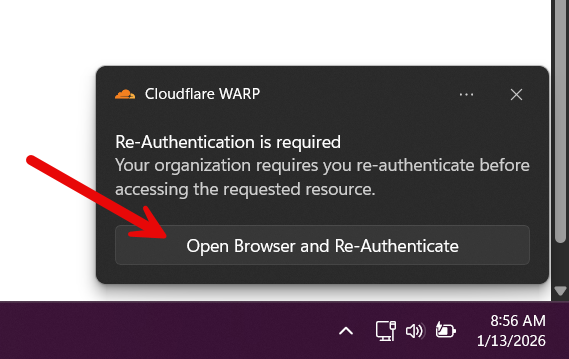 A re-authentication prompt will pop up in the lower right-hand corner near the time on the task bar. It will look something like this: