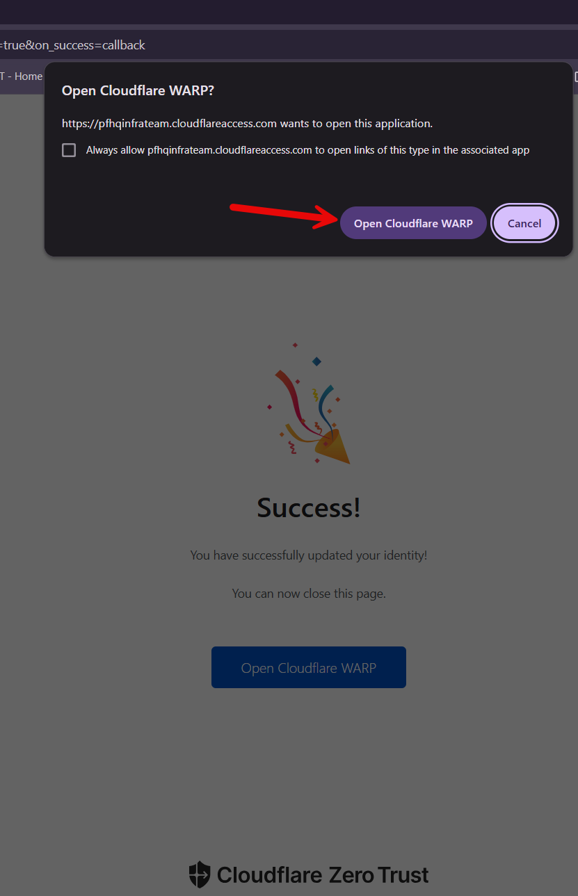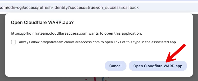Once authenticated, an Open Cloudflare WARP prompt will pop-up in your browser. Click Open Cloudflare WARP.